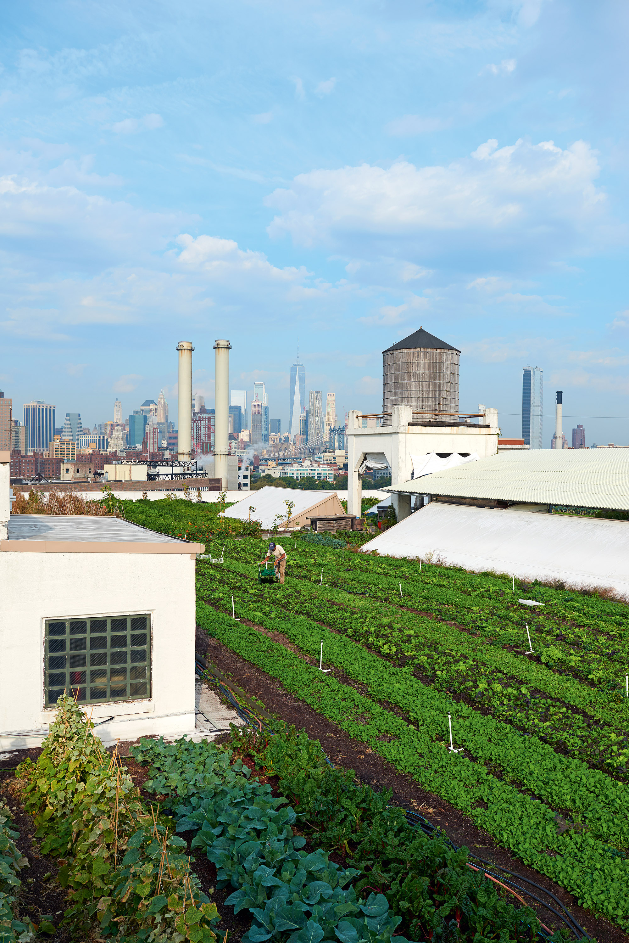 Schillernde Kolibris schwirren von Blüte zu Blüte, Bienen summen um Bienenstöcke – in der Ferne, auf der anderen Seite des East River, ragen die Türme von Manhattans Midtown empor. Tracy ist eine der freiwilligen Helfer, die Besucher durch die Dachgärten von Brooklyn Grange führt. „Grange“ bedeutet Gehöft oder Bauernhof, und Brooklyn Grange gilt mit seinen drei Dachgärten in Brooklyn und Queens und einer Gesamtfläche von 2,3 Hektar als größte Rooftop Farm in der Metropolregion von New York City mit 19 Millionen Menschen.