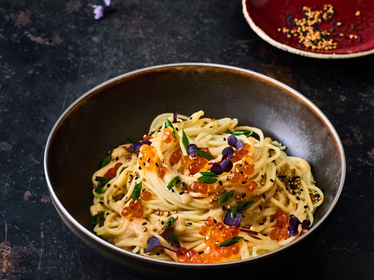 Miso und Pasta sind die perfekte Kombination für ein schnelles Abendessen. Das Rezept von Stevan Paul mit Butter, geröstetem Sesam und Forellenkaviar dauert nur 15 Minuten – Umami pur.